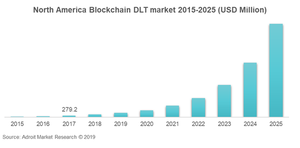 Some of the major trends observed in US the largest market for Blockchain DLT technology are, the state of Delaware is testing a Blockchain-based corporate registry system to explore share issuance. Elsewhere in the United States, several national agencies such as the General Services Administration (GSA), the Health and Human Services Department and the Department of Homeland Security—have declared Blockchain programs. States such as Illinois, New York, and Texas are also testing Blockchain applications.