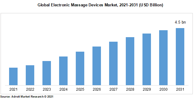 The market for electronic massage devices is anticipated to increase from USD 2.9 billion in 2020 to USD 4.5 billion in 2031, at a CAGR of 5.1% over the course of the forecast period (2021-2031).