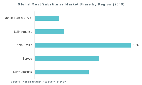 The global meat substitutes market is cumulative to Asia-Pacific, North America, Latin America, and Middle East & Africa. Asia-Pacific dominated the global meat substitutes market in 2019. However in the forecasted period, tNorth America is expected to grow at the highest pace by 2025.