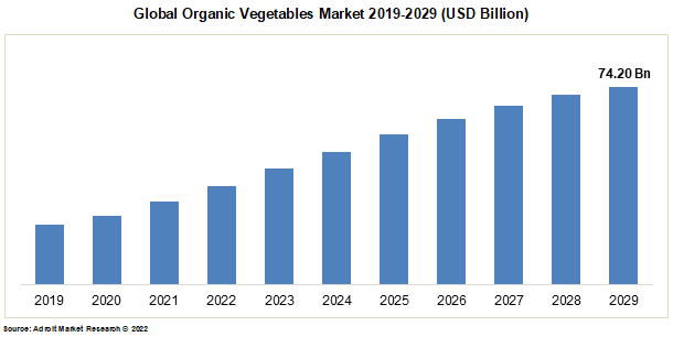 The global organic vegetables market is predicted to grow close to USD 74.20 billion by 2029 at a Compound Annual Growth Rate (CAGR) of 8.2 percent during the forecast period 2022-2029.