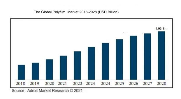 At a compound annual growth rate of 4.15%, the size of the worldwide Increasing consumption of packaged products from multiple industries is driving the Polyfilm market is projected to reach USD 1.93 billion in 2028.