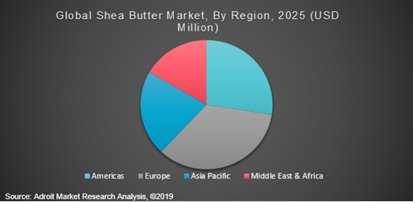 Based on regional segmentation, the market for shea butter are in North America, Europe, Asia Pacific, and Middle East and Africa. Europe region is having the largest market share in global shea butter market due to government policies where, they got approval to use shea butter in edible products such as chocolates from Europe’s EC and U.S.FDA which is expected to bolster the shea butter market in this region.