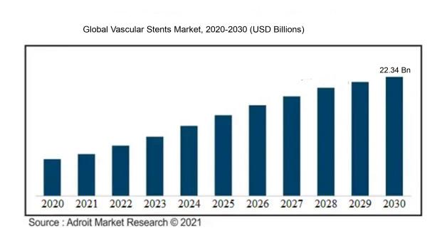 The market for Global Vascular Stents was estimated to be worth USD 10.32 billion in 2022, and from 2022 to 2030, it is anticipated to grow at a CAGR of 7.24%, with an expected value of USD 22.34 billion in 2030.
