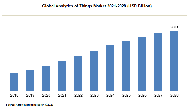 The global analytics of things market size is anticipated to hit USD 58 billion by 2028, at a CAGR of 30% over the forecast period. AoT analytics provide users with real-time data. Because of high-tech sensor partnerships, it is now simple to generate meaningful data. Enterprises can utilize the extracted data to make better real-time choices. The ease of implementation and lower component prices are accelerating the use of analytics of things. Analytics of Things (AoT) is utilized in a variety of applications, including building automation, infrastructure management, and security management. It also makes it easier to analyze vast volumes of data provided by AoT. It aids in data connectivity, management, transformation, aggregation, and processing, as well as delivering real-time insights. Enterprises may profit from the solutions' cost efficiency, real-time reviewing, and scalability. These factors are anticipated to give the market a substantial boost during the projected period.